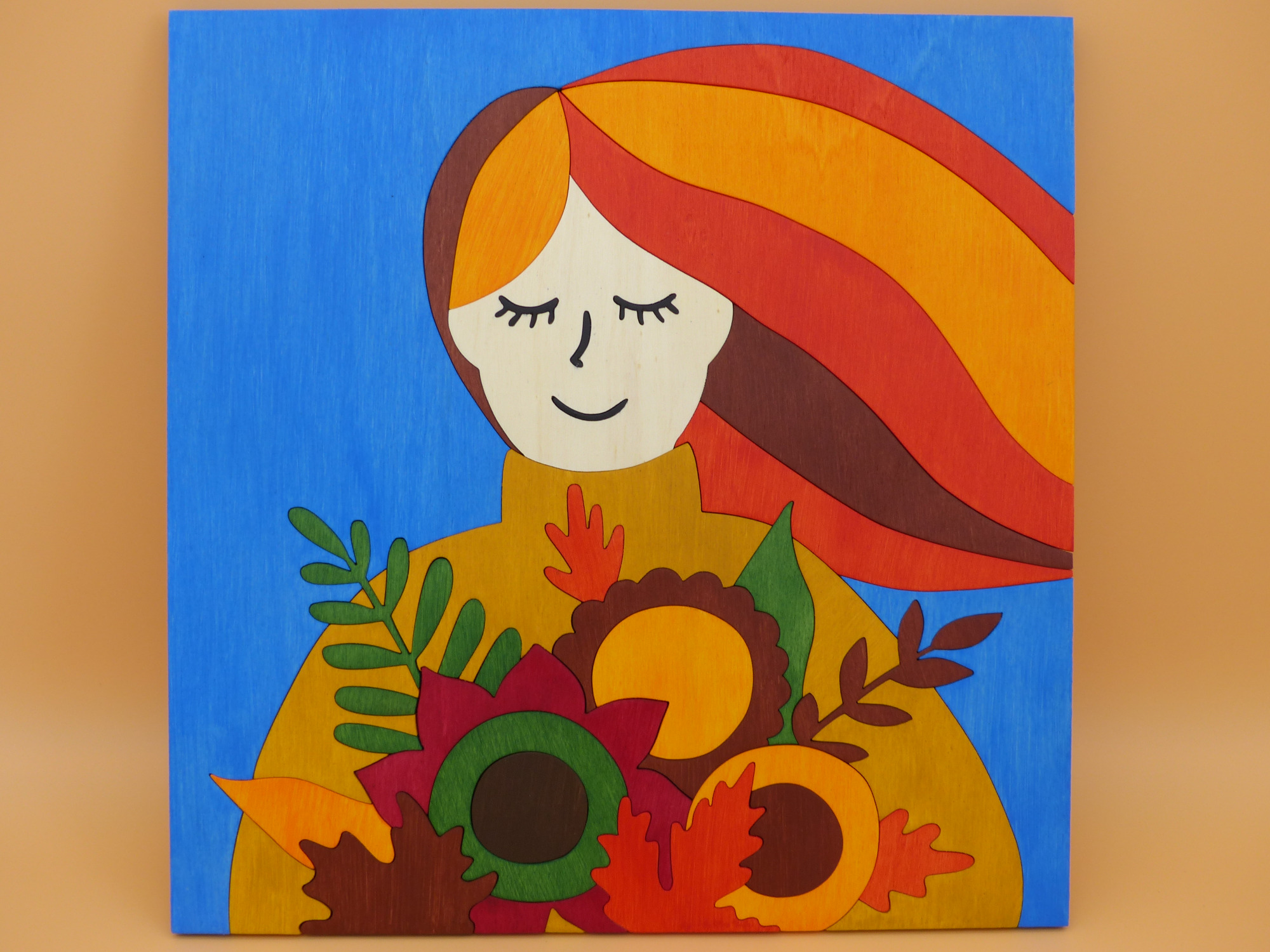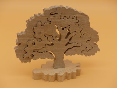 Das gewünschte Motiv wird von Hand auf das Holz übertragen und mithilfe der Dekupiersäge ausgesägt. Einzelne Motivteile werden geschliffen und verleimt.